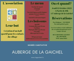 Pour les soutenir et donner un coup de pouce à l’association « Les amis de Gounnine », nous vous relayons les informations concernant un souper qui sera organisé le jeudi 12 octobre à la Gaichel afin de récolter des fonds. N’hésitez pas à vous y inscrire